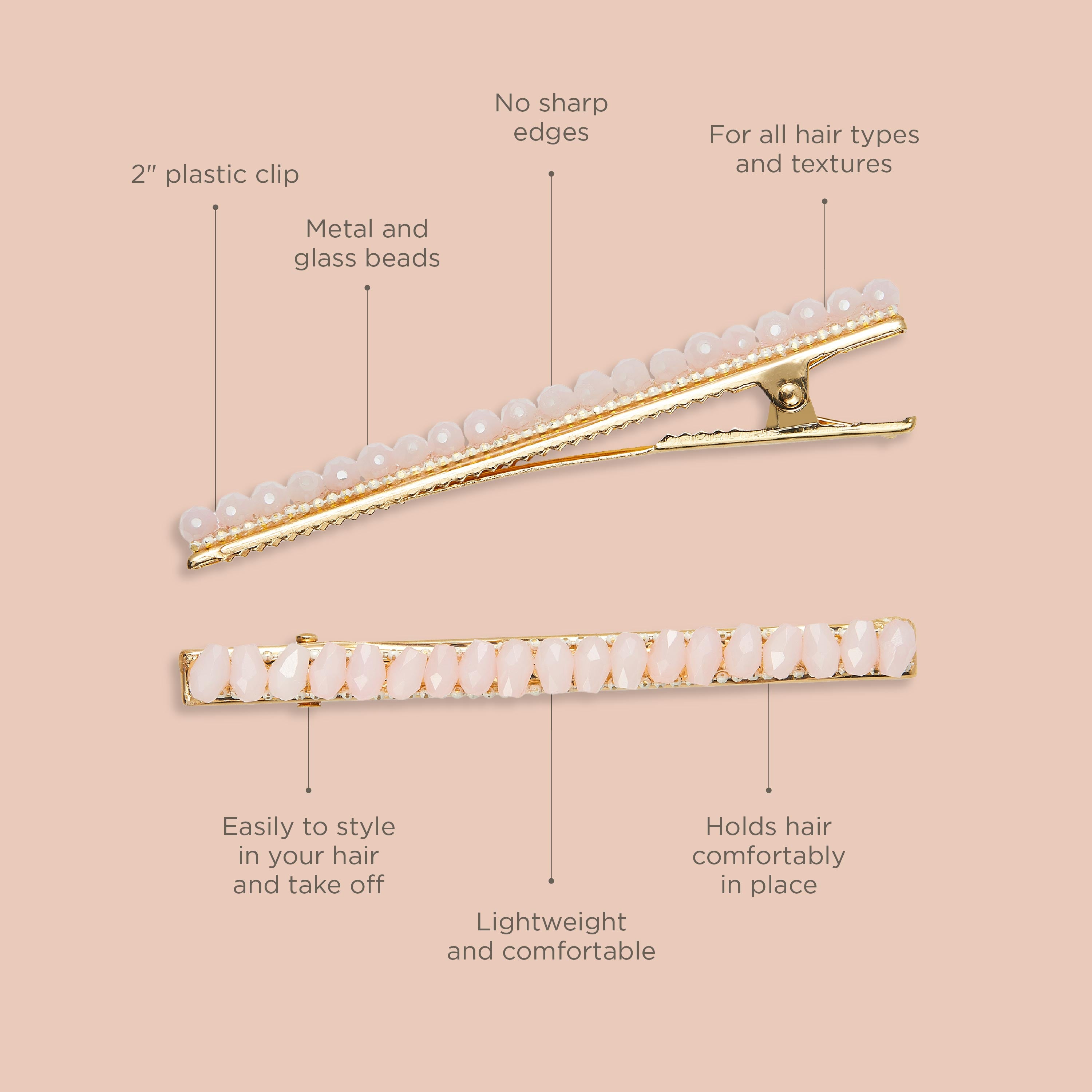 These unique seed bead barrettes hold hair back while adding a sleek finishing touch to your look. Complements updos or accents loose styles.