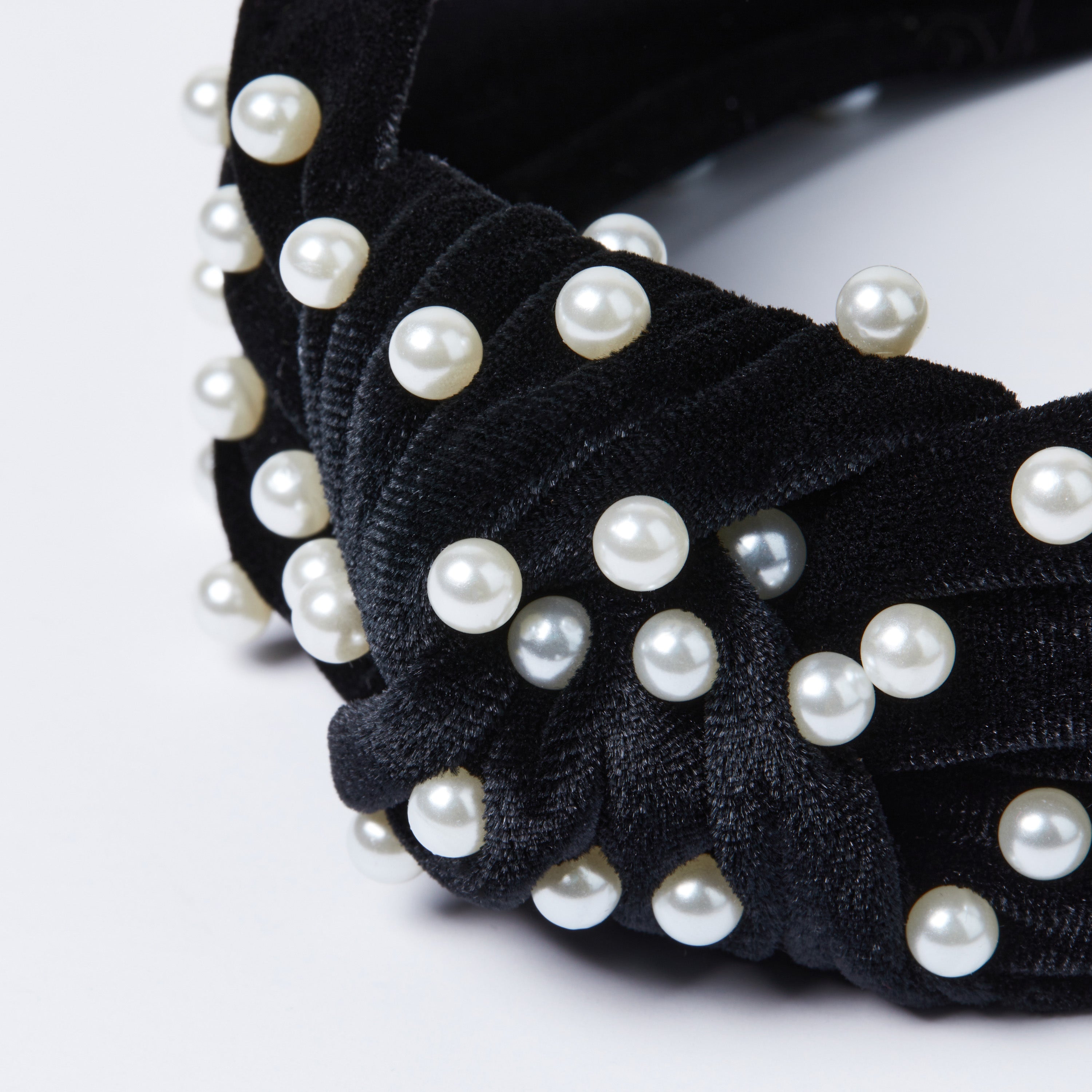 This soft velvet headband with a chic knotted detail at the top is decorated with pearls and dresses up any outfit.