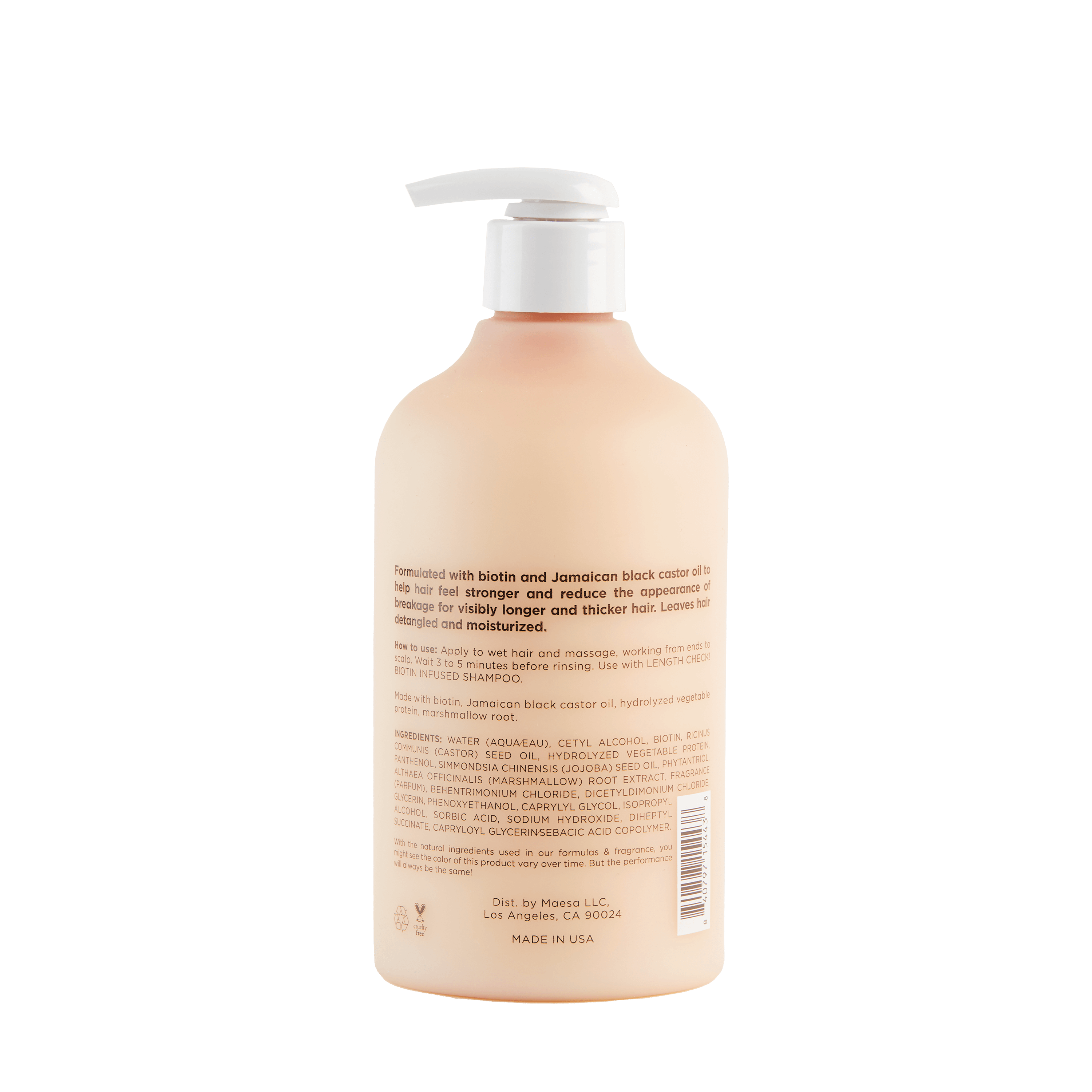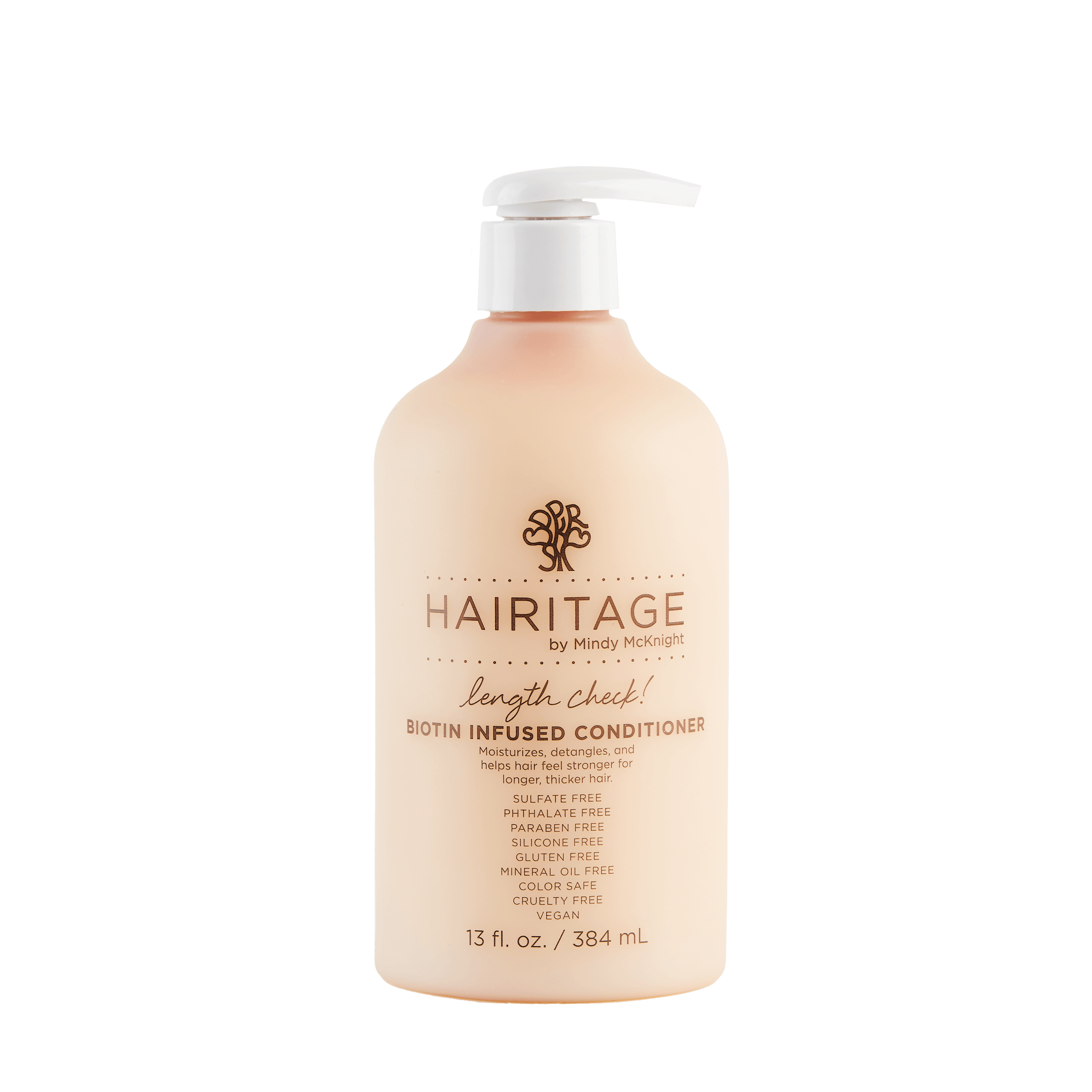 Hairitage Length Check! Biotin Infused Conditioner. Formulated with biotin and Jamaican black castor oil to help hair feel stronger and reduce the appearance of hair breakage for visibly longer and thicker hair. Detangles hair, leaving it feeling moisturized and conditioned.