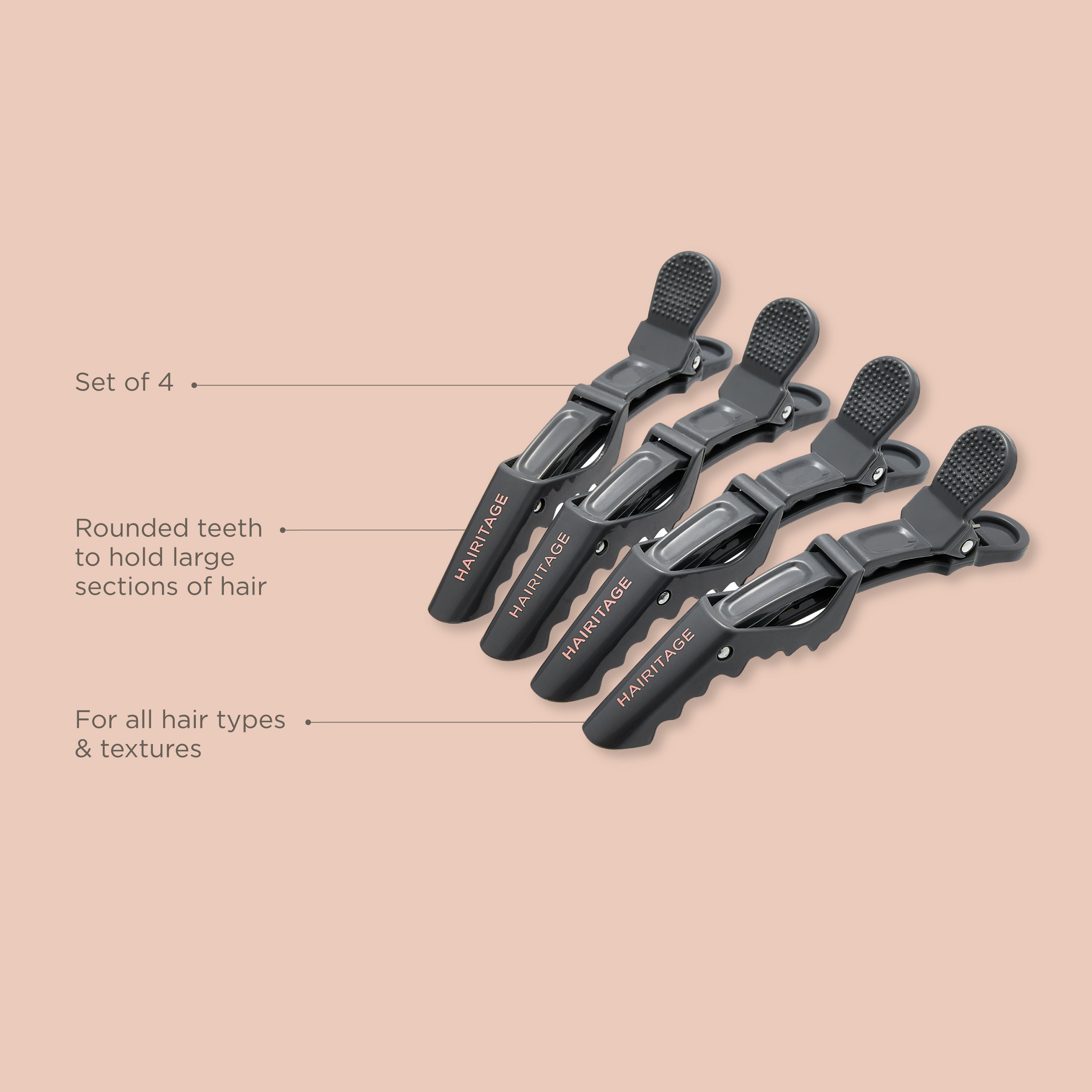 Our Out of My Way Alligator Hair Clips securely hold hair out of your way to easily section hair while coloring, cutting, drying, and styling. Can be used on wet or dry hair. Perfect for all hair types and textures.