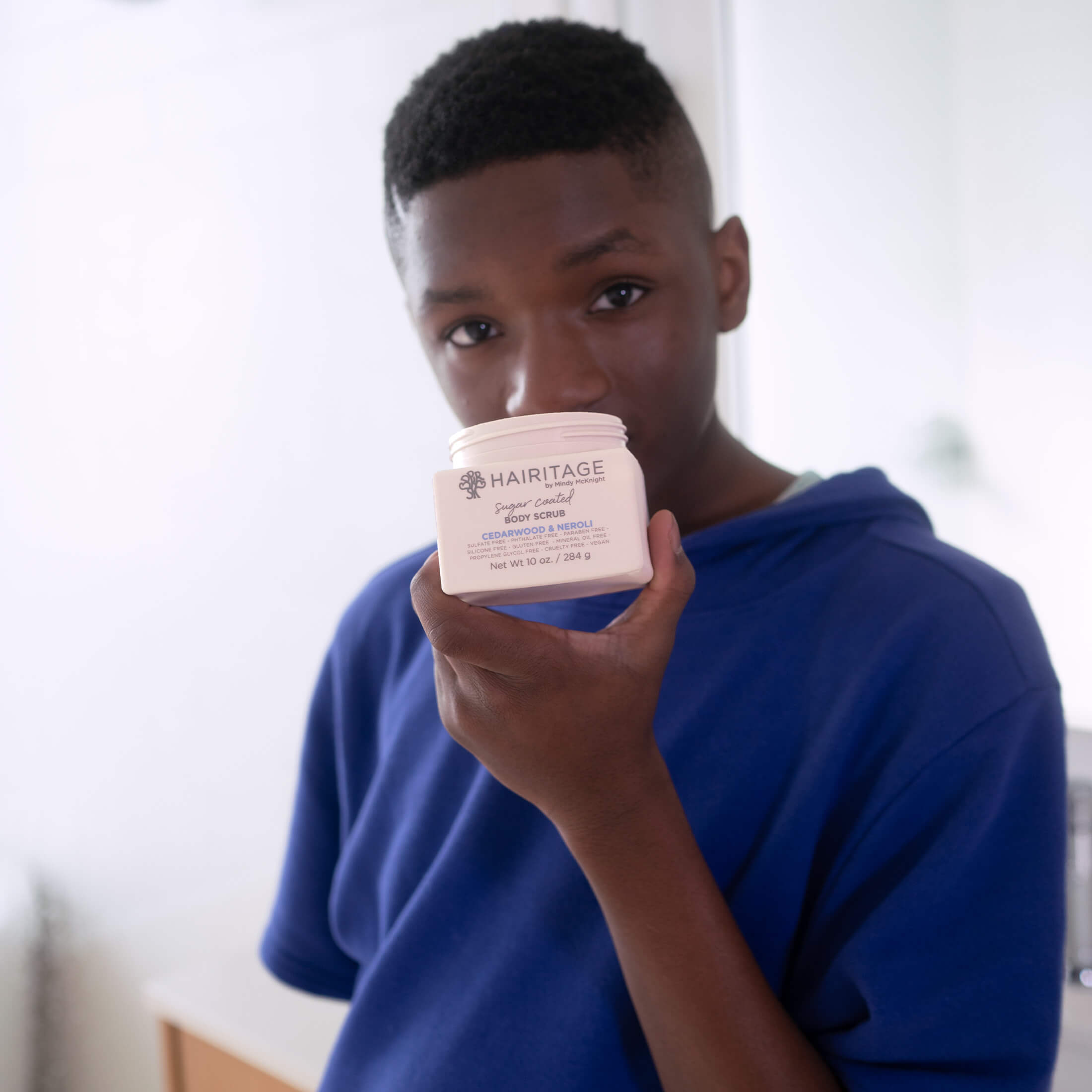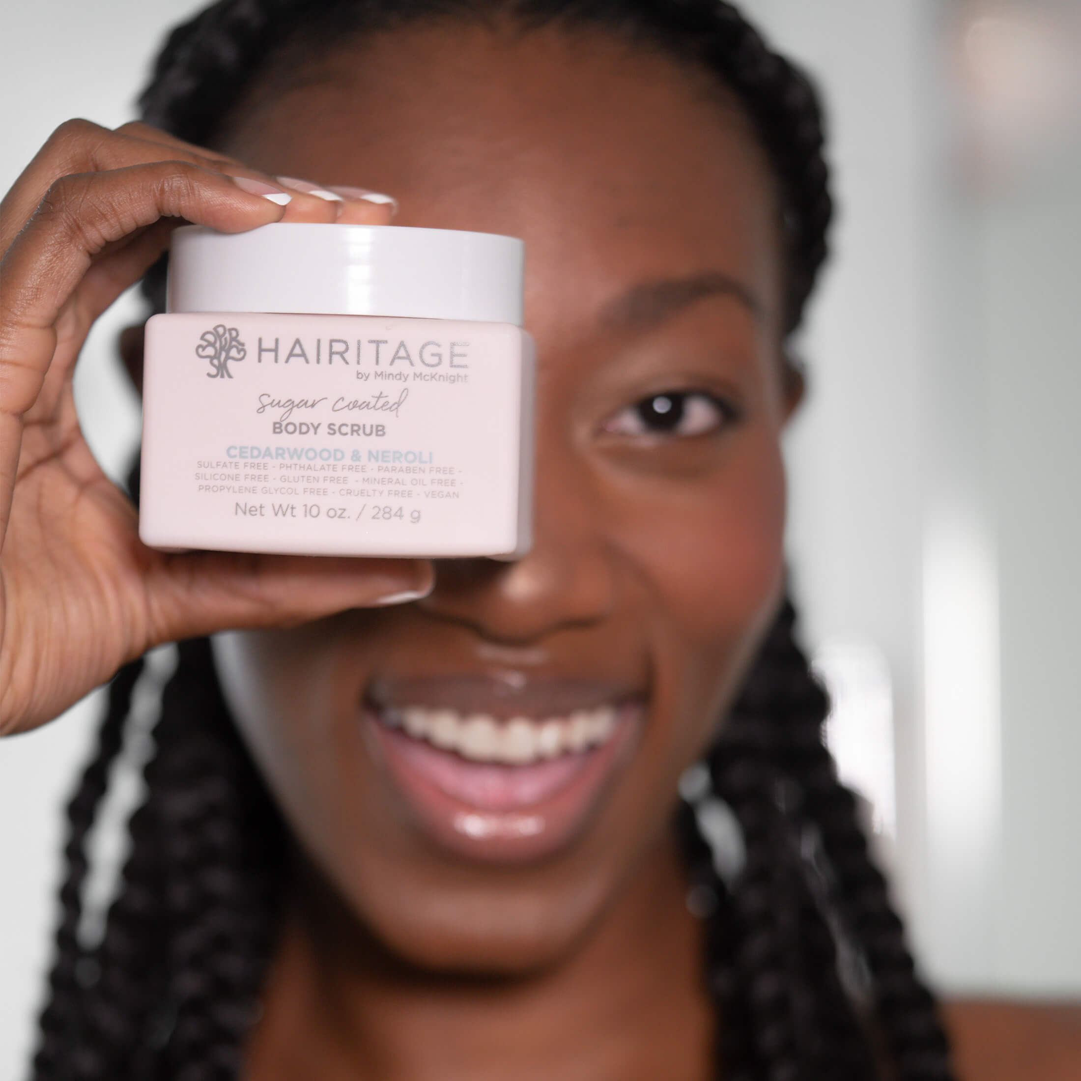 Hairitage Sugar Coated Exfoliating Body Scrub rejuvenates and gently buffs away buildup while leaving skin feeling renewed...