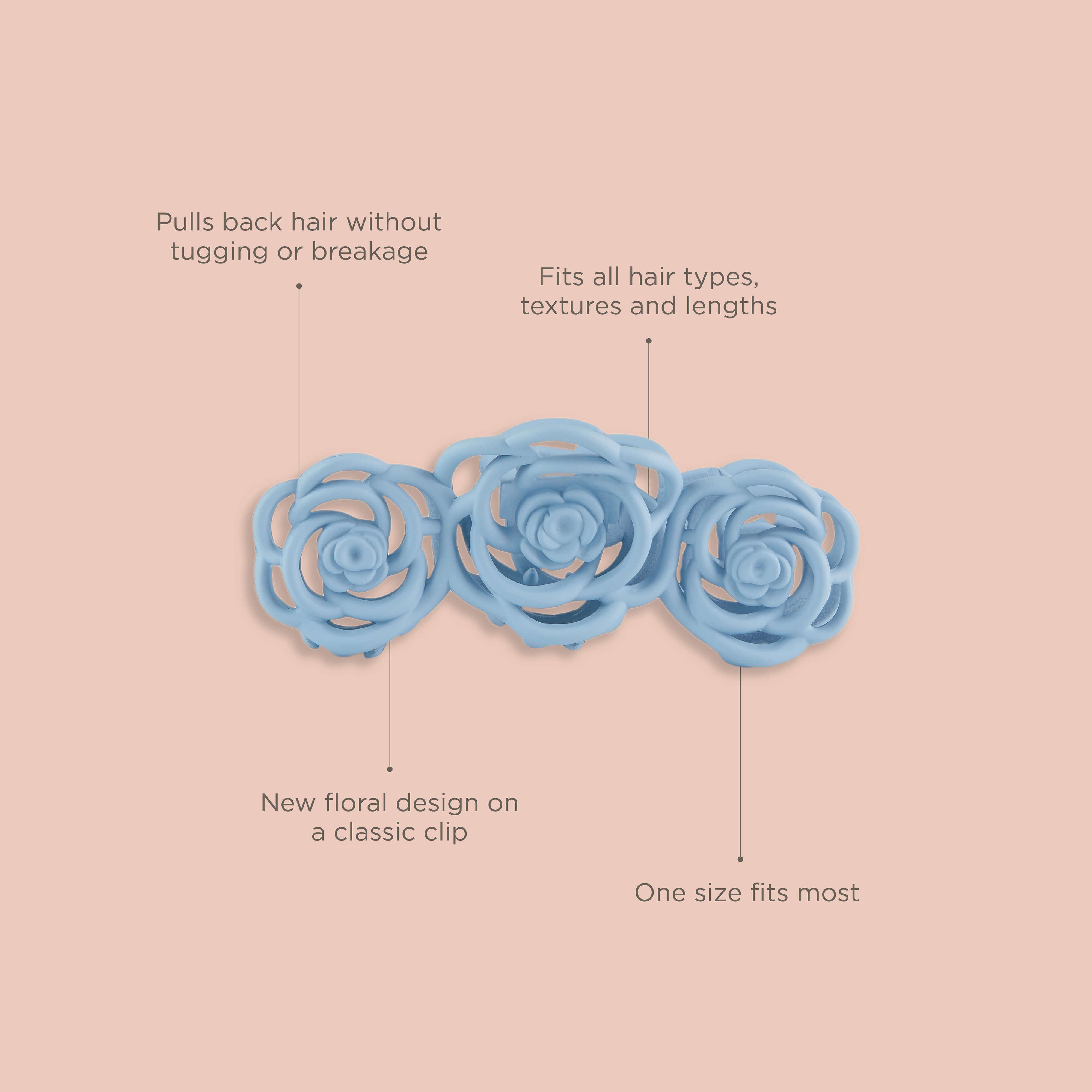 The Hairitage by Mindy Rose Claw Clip adds the perfect touch to any look, now you can always have flowers in your hair! Perfect for all hair types, textures, & lengths. Our Mission: Combining the trends of #EverydayElegance and #Nuhistorics this collection takes inspiration from the worlds of Bridgerton, The Gilded Age and Downtown Abbey. Theatrical and decadent fabrics including brocade, jacquard and satins in rich tones can be combined with modern casual corsets, hoodies and cargo shorts, giving the category a playful and feminine spin. Wallpaper stripes and florals on sumptuous fabrics work the theme into scrunchies and bows while pearl accents and colorful claw clips make easy work of a quick and chic chignon updo. This Hairitage collection will have you ready for the ball, or ballgame!