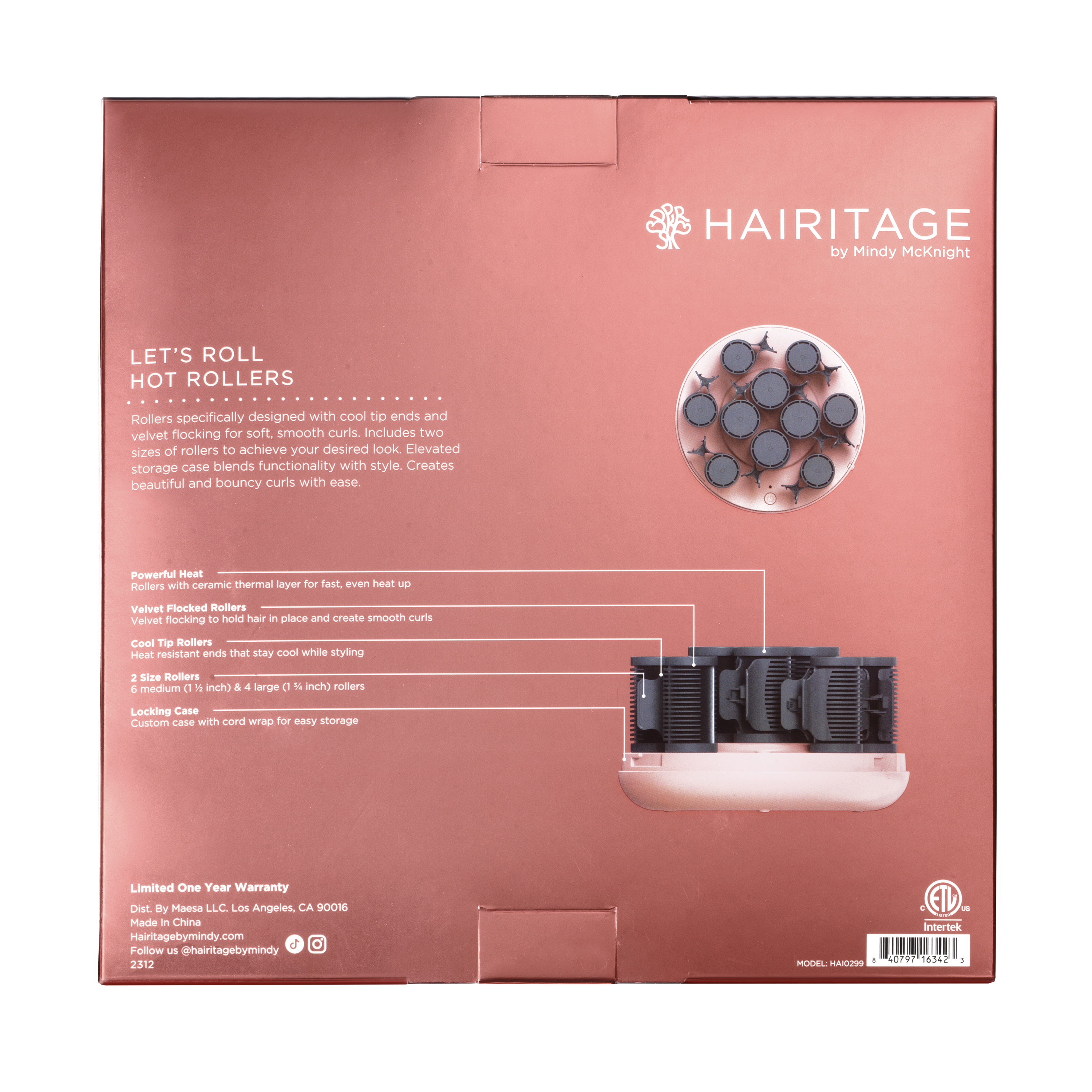 Hairitage Let's Roll Ceramic Thermal Hot Rollers includes 10 Rollers & 10 Clips that are specifically designed with rapid heat technology to deliver fast and even heat and features heat-resistant cool tip ends that stay cool while styling. Each ceramic barrel is covered in velvet flocking to create beautiful, bouncy soft & smooth curls with ease. Full set includes 10 rollers in 2 sizes to achieve your desired look: 6 Medium (1 ½ inch) hot rollers and 4 Large (1 ¾ inch) hot rollers. The elevated case blends functionality with style and is perfect for storage. Designed for all hair types & textures.