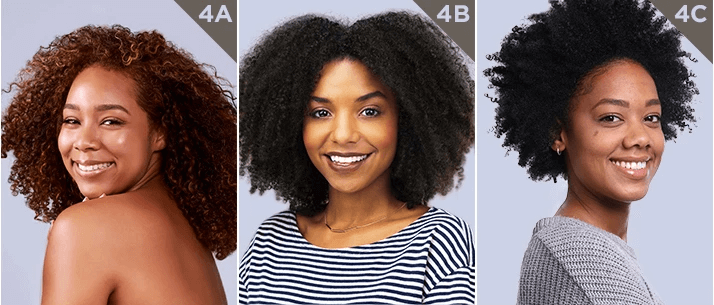 Hair has no real curl pattern and less definition (not a curl and not a wave). The tightest and coarsest of Type 4 hair