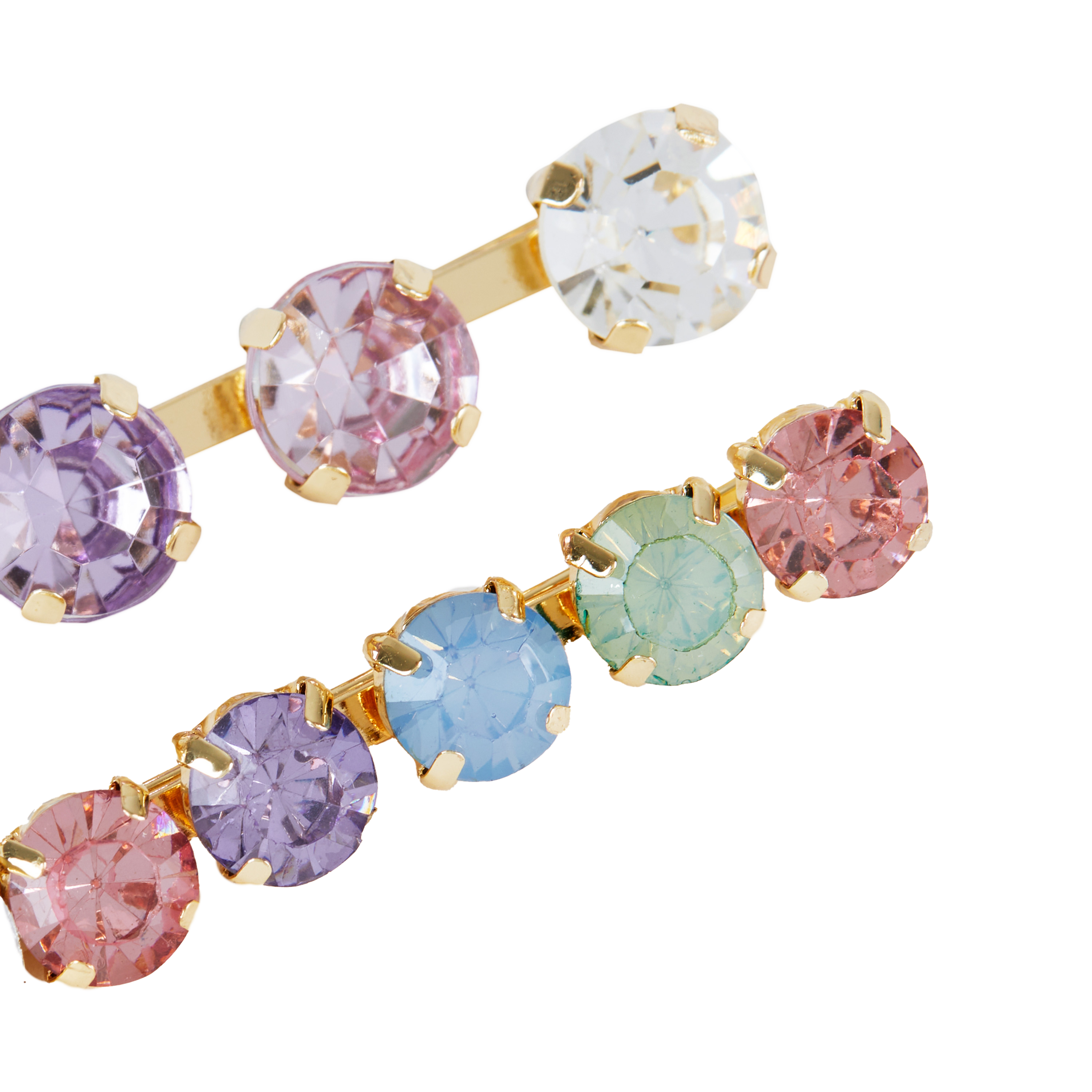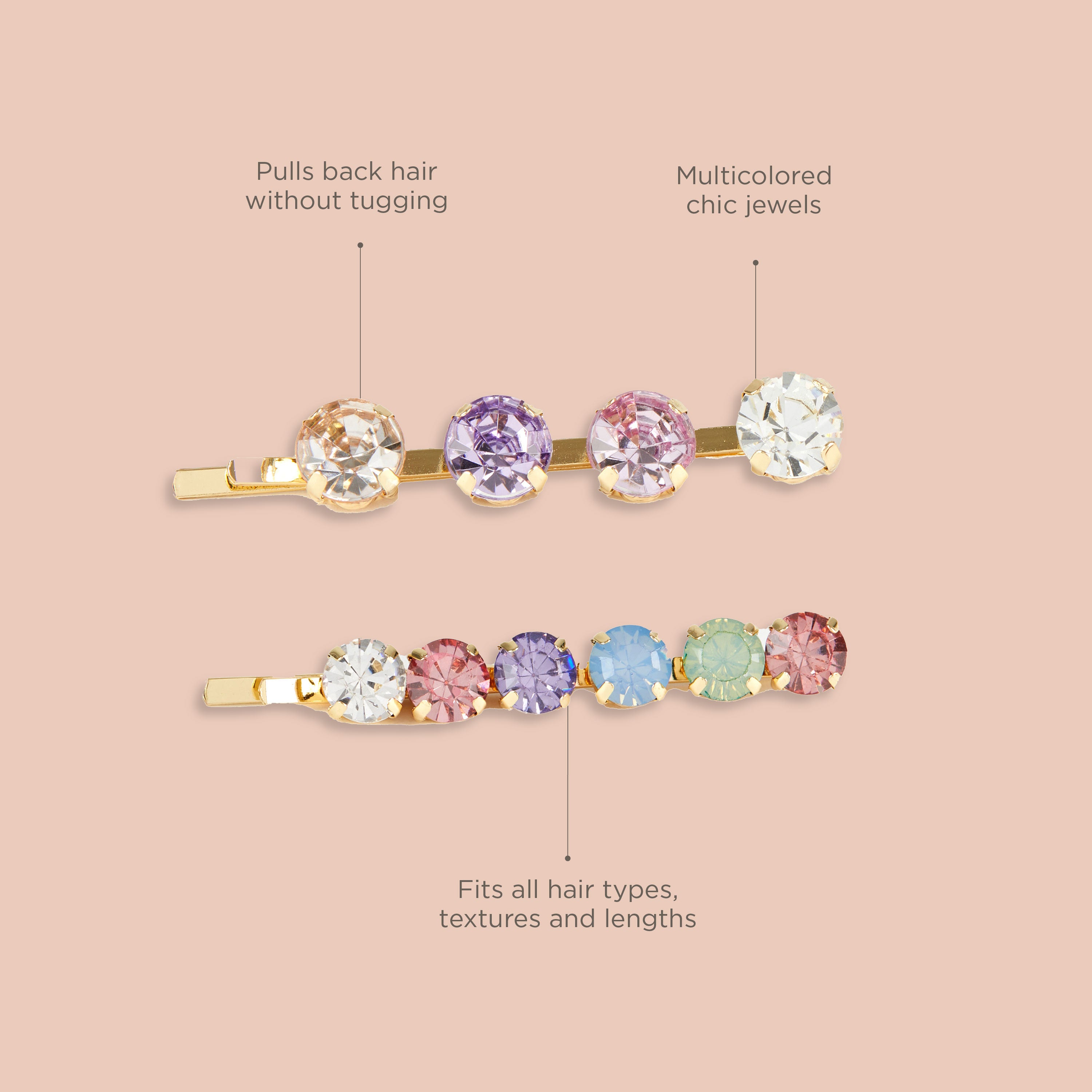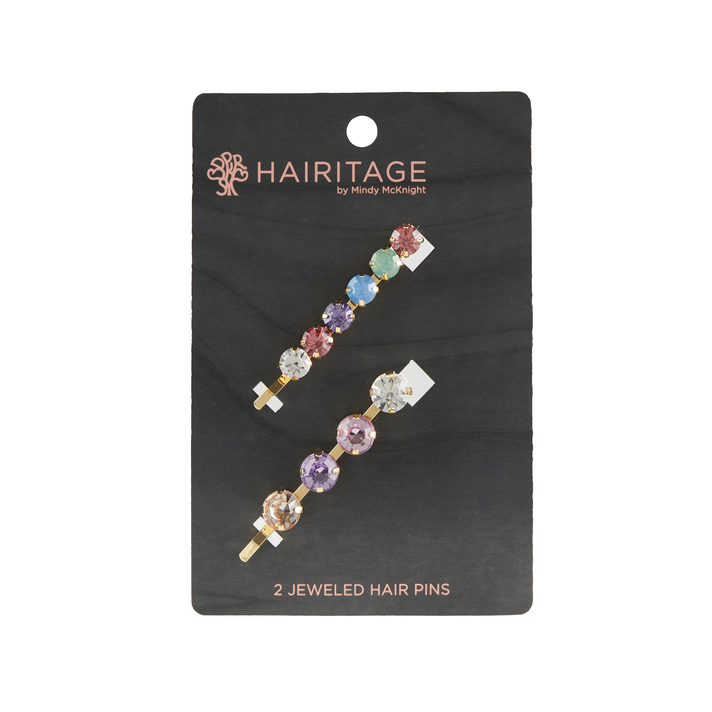 Pull back your hair with the Hairitage by Mindy Jeweled Bobby Pins featuring 4-6 multicolor stones to add a little sparkle to your style. Perfect for all hair types, textures, & lengths. Our Mission: Combining the trends of #EverydayElegance and #Nuhistorics this collection takes inspiration from the worlds of Bridgerton, The Gilded Age and Downtown Abbey. Theatrical and decadent fabrics including brocade, jacquard and satins in rich tones can be combined with modern casual corsets, hoodies and cargo shorts, giving the category a playful and feminine spin. Wallpaper stripes and florals on sumptuous fabrics work the theme into scrunchies and bows while pearl accents and colorful claw clips make easy work of a quick and chic chignon updo. This Hairitage collection will have you ready for the ball, or ballgame!
