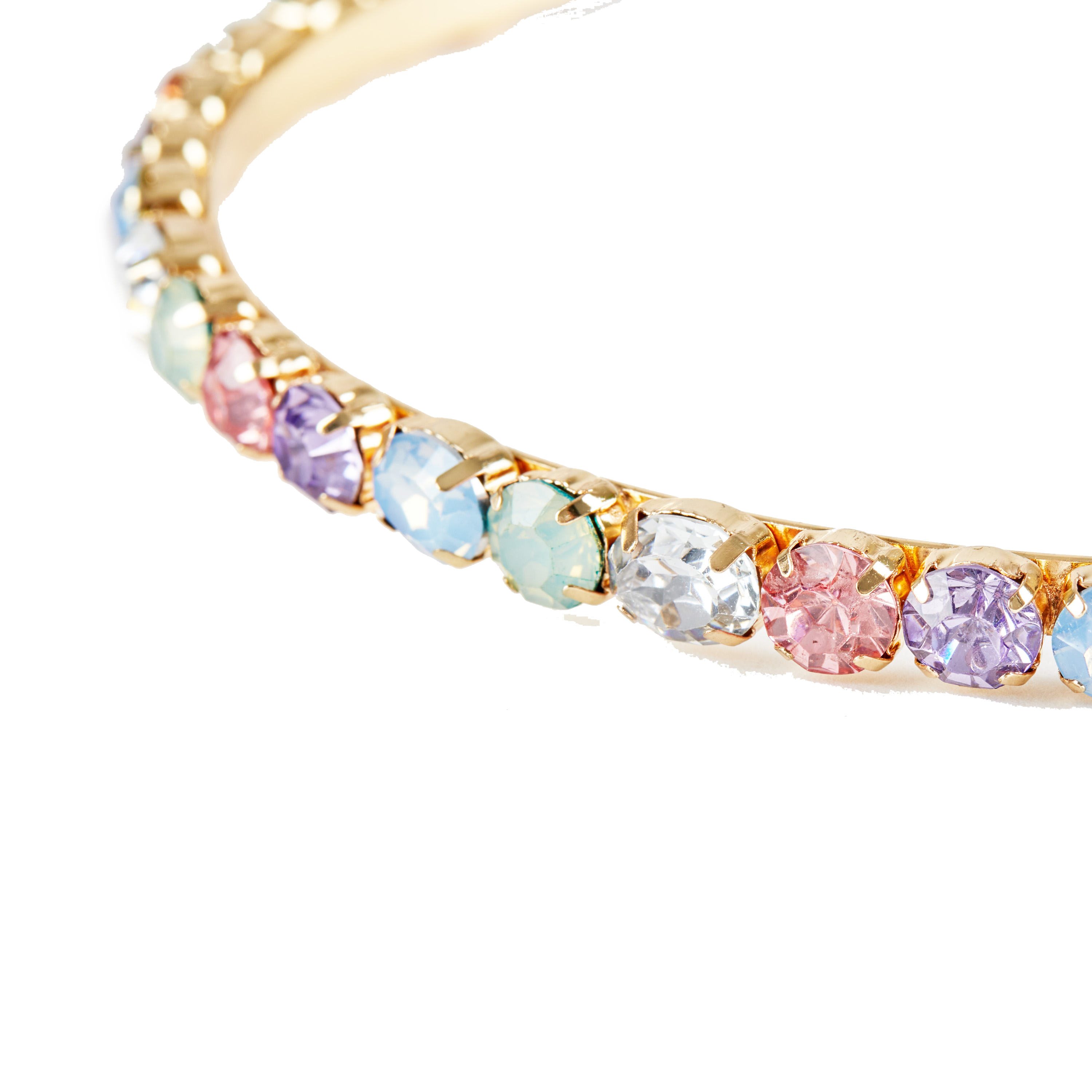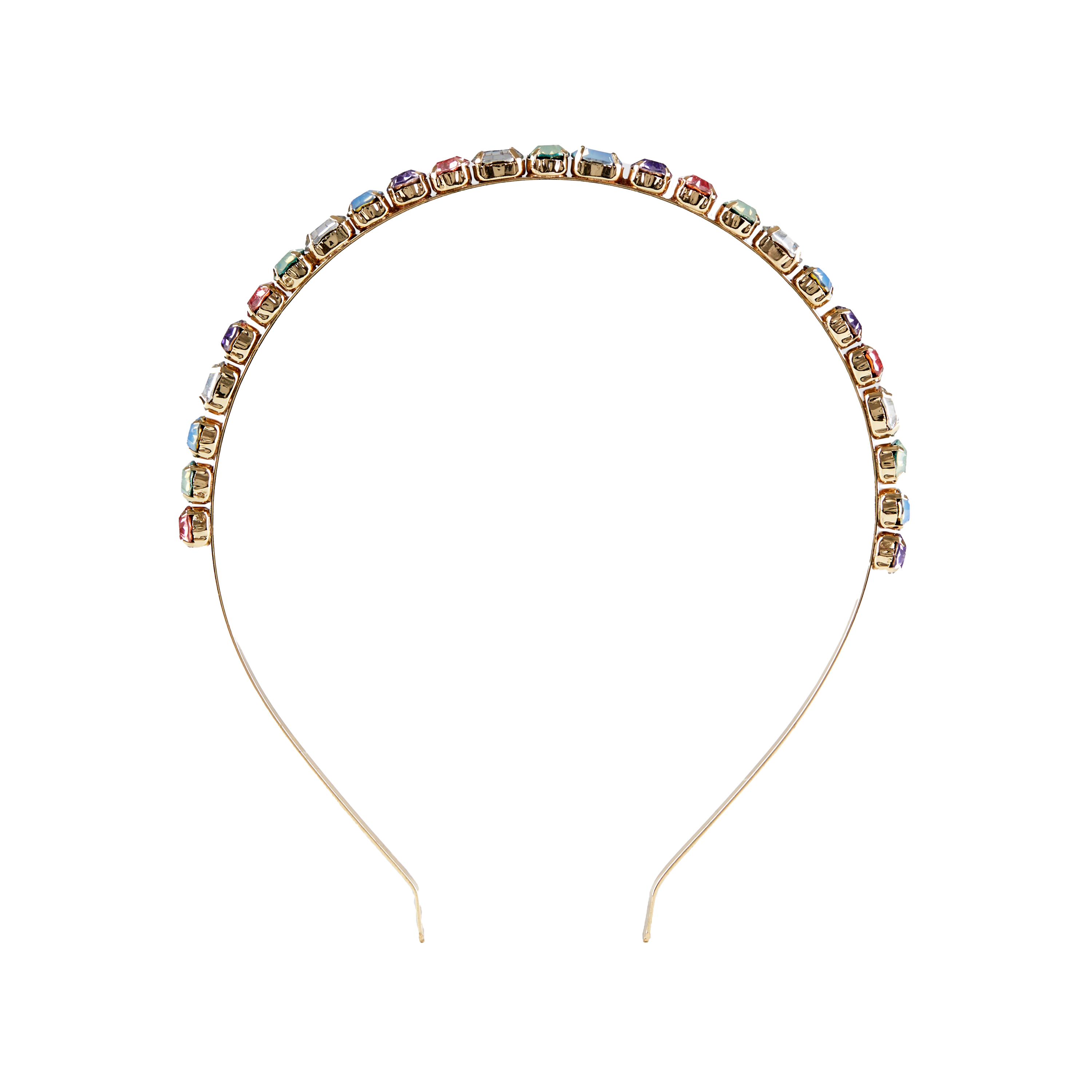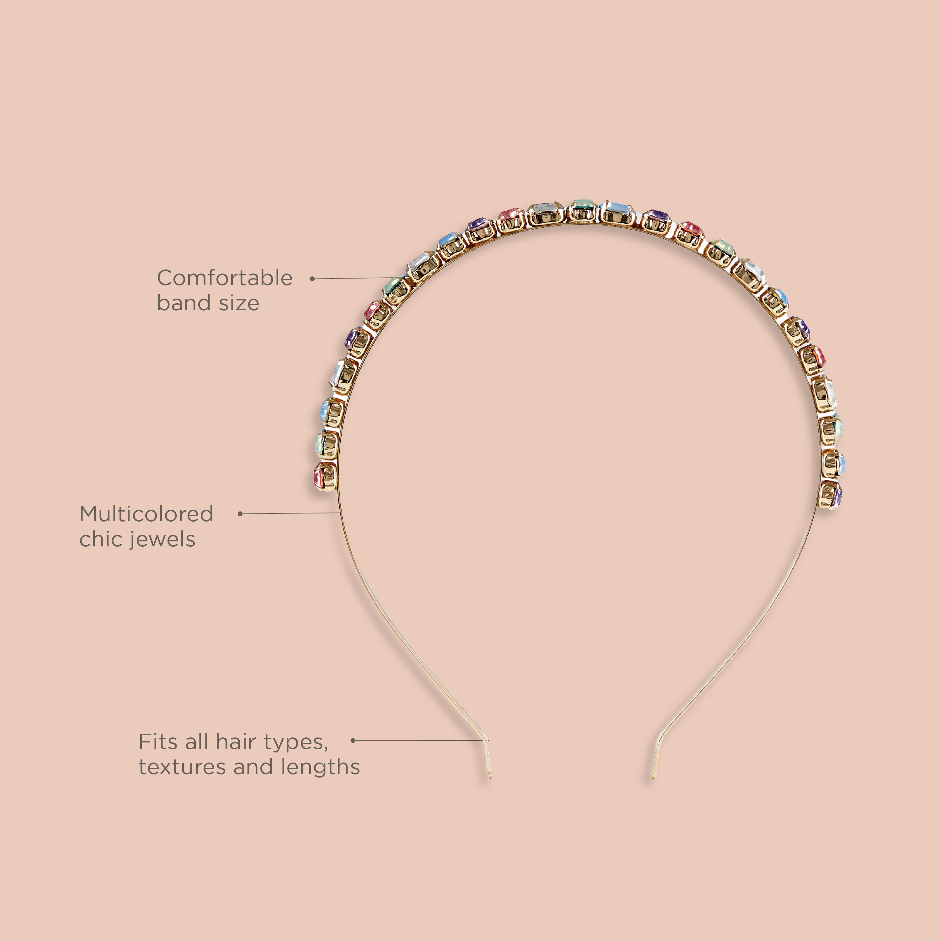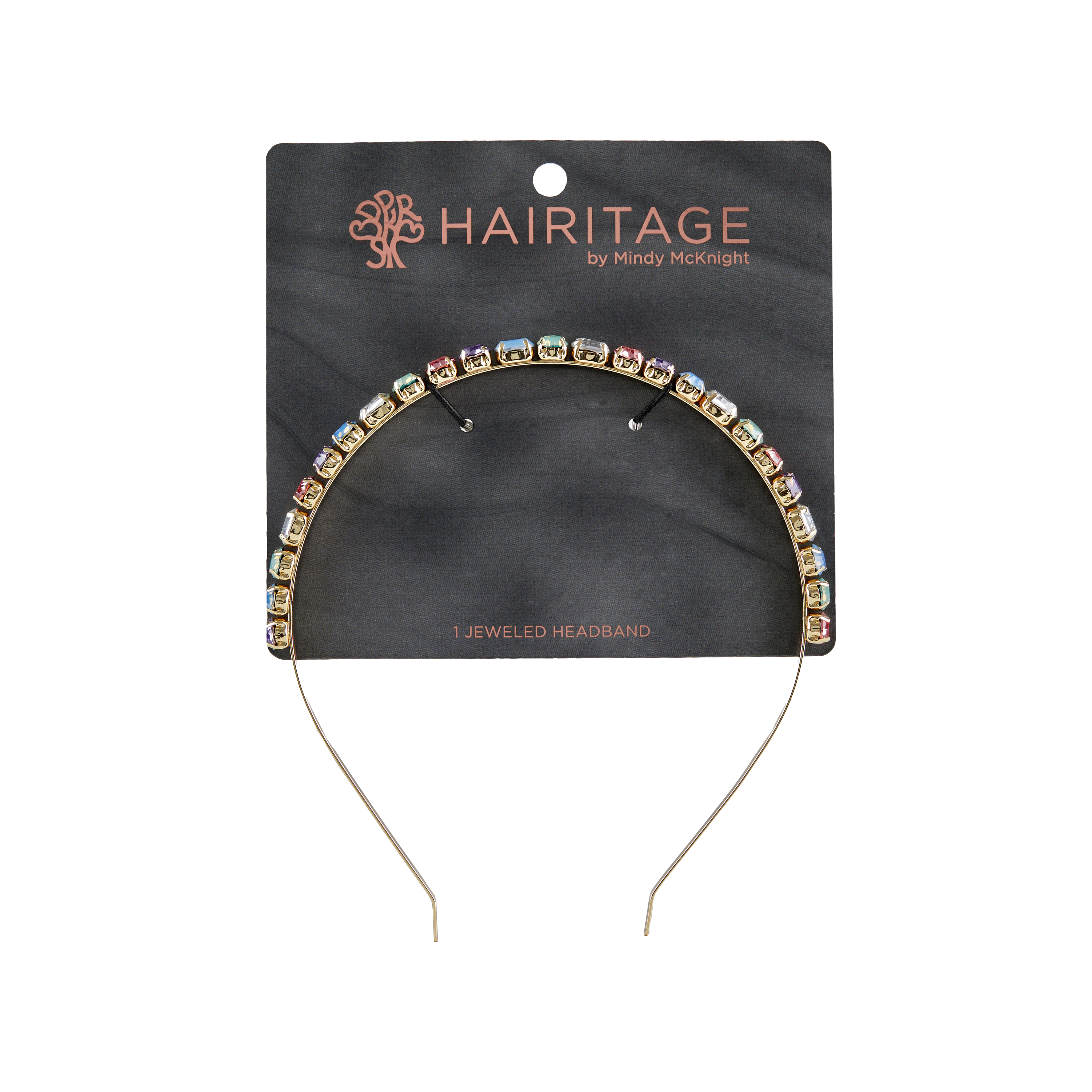Look like royalty with the Hairitage by Mindy Jeweled Headband. The multicolor jewels add a fun pop of color to every outfit! Perfect for all hair types, textures, & lengths. Our Mission: Combining the trends of #EverydayElegance and #Nuhistorics this collection takes inspiration from the worlds of Bridgerton, The Gilded Age and Downtown Abbey. Theatrical and decadent fabrics including brocade, jacquard and satins in rich tones can be combined with modern casual corsets, hoodies and cargo shorts, giving the category a playful and feminine spin. Wallpaper stripes and florals on sumptuous fabrics work the theme into scrunchies and bows while pearl accents and colorful claw clips make easy work of a quick and chic chignon updo. This Hairitage collection will have you ready for the ball, or ballgame!